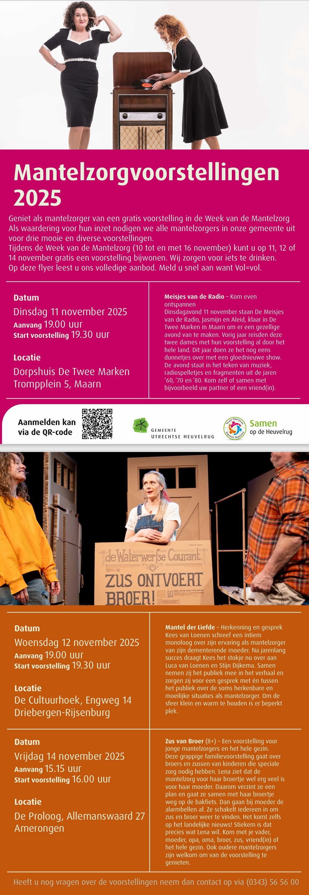 Mantelzorgers van een inwoner van de Utrechtse Heuvelrug kunnen ondersteuning krijgen van de Sociale Dorpsteams. Het kan gaan om informatie en advies maar ook om hulp bij regeltaken of het inschakelen van mantelzorgvrijwilligers. Meer informatie vindt u op de website van Samen op de Heuvelrug.