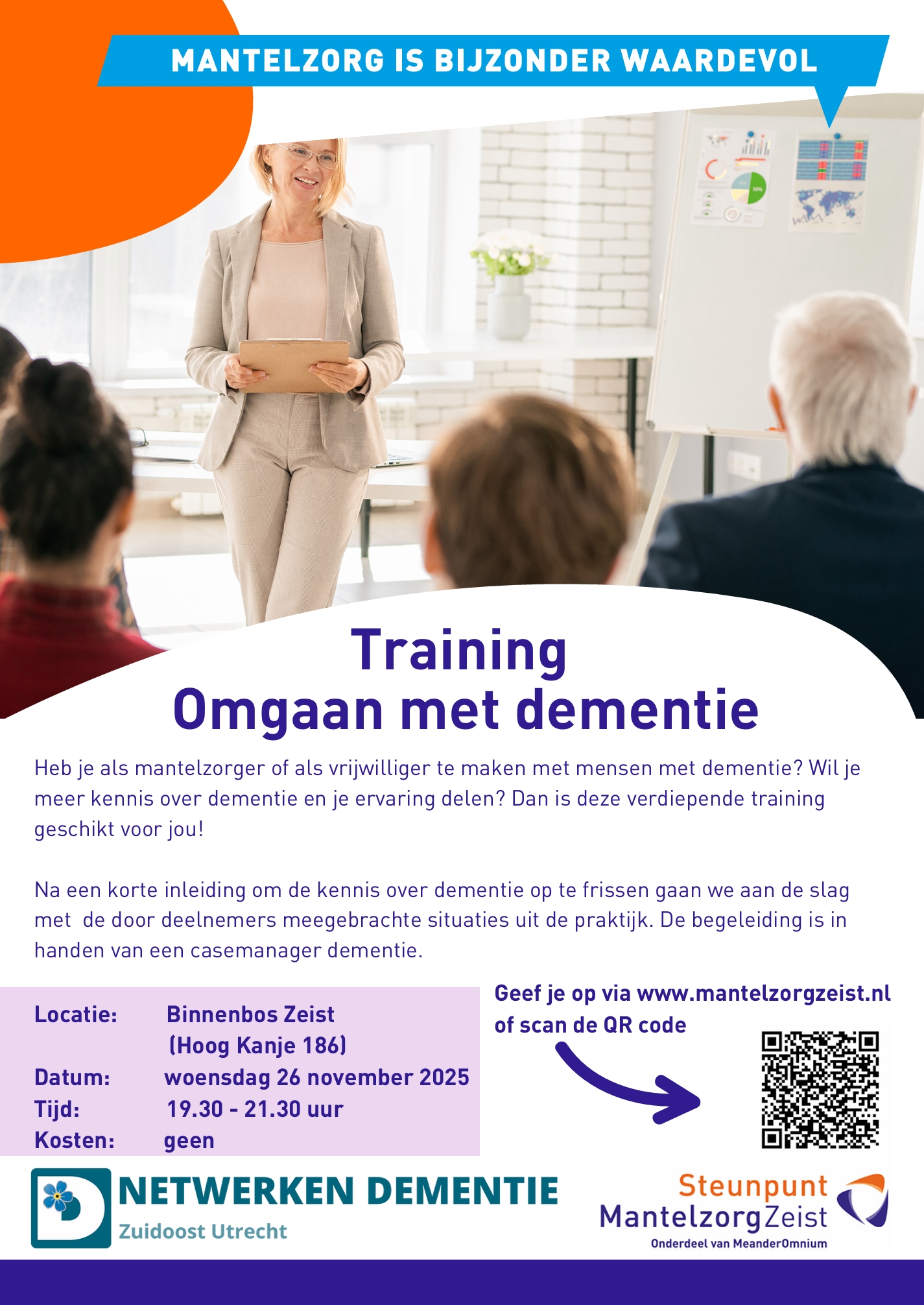 Elke eerste woensdag van de maand is er van 10-11.30 een ontmoetingsgroep voor mantelzorgers van een naaste met dementie. Deelname aan deze groep biedt je gerichte informatie en uitwisseling van ervaringen met anderen die een vergelijkbaar proces doormaken. Meer informatie vind je in de flyer. Voor het programma klik hier.