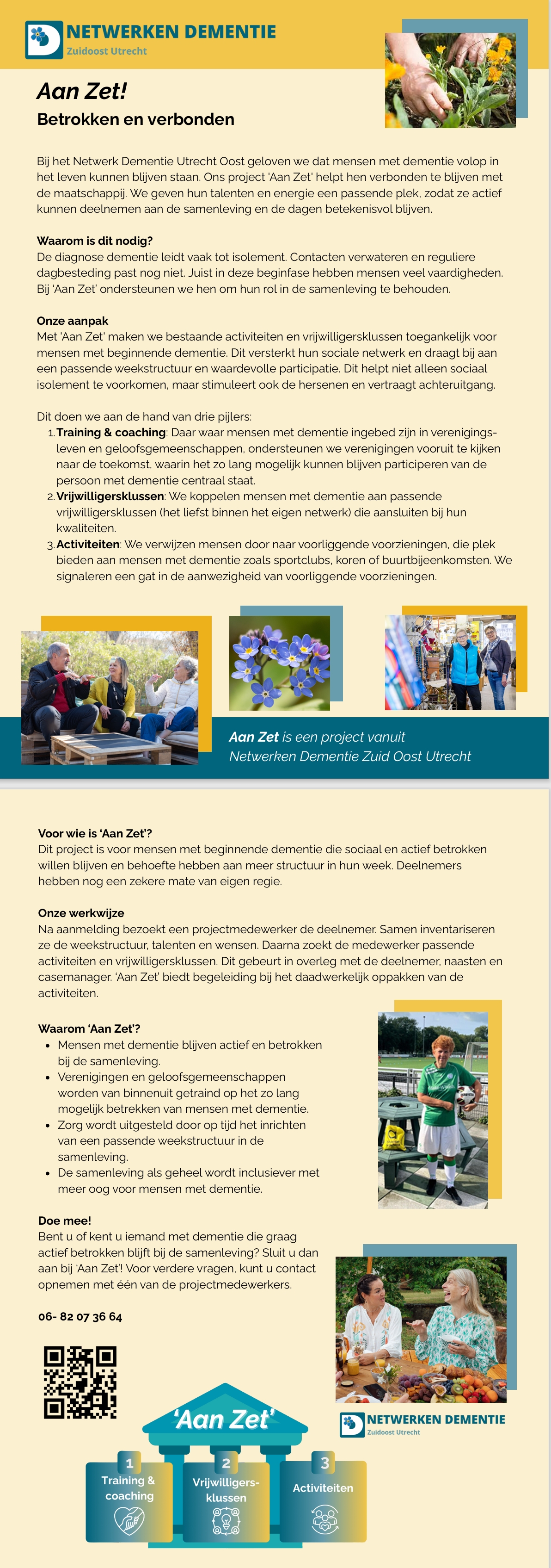 Op onze website vindt u allerlei informatie over dementie en mantelzorgondersteuning in de regio Zuid Oost Utrecht. Keten Netwerk Zuid Oost Utrecht is een samenwerkingsverband tussen verschillende partijen die zich bezighouden met zorg en welzijn voor mensen met dementie en hun mantelzorgers in onze regio. Netwerk Zuid Oost Utrecht maakt de samenwerking tussen deze partners makkelijker. Zo kunnen we samen plannen ontwikkelen en zo goed mogelijk klaarstaan voor mensen met dementie en hun naasten.
